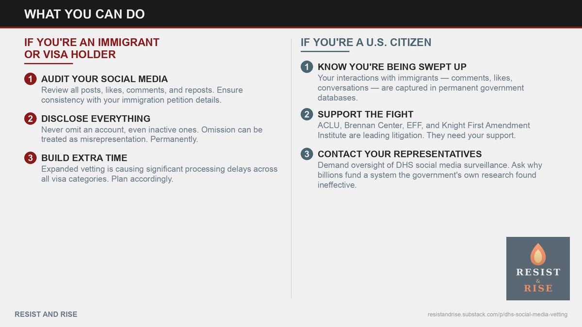 Contact your representatives. Demand oversight of DHS social media surveillance programs. Ask why billions are being spent on a system the government’s own research found largely ineffective.