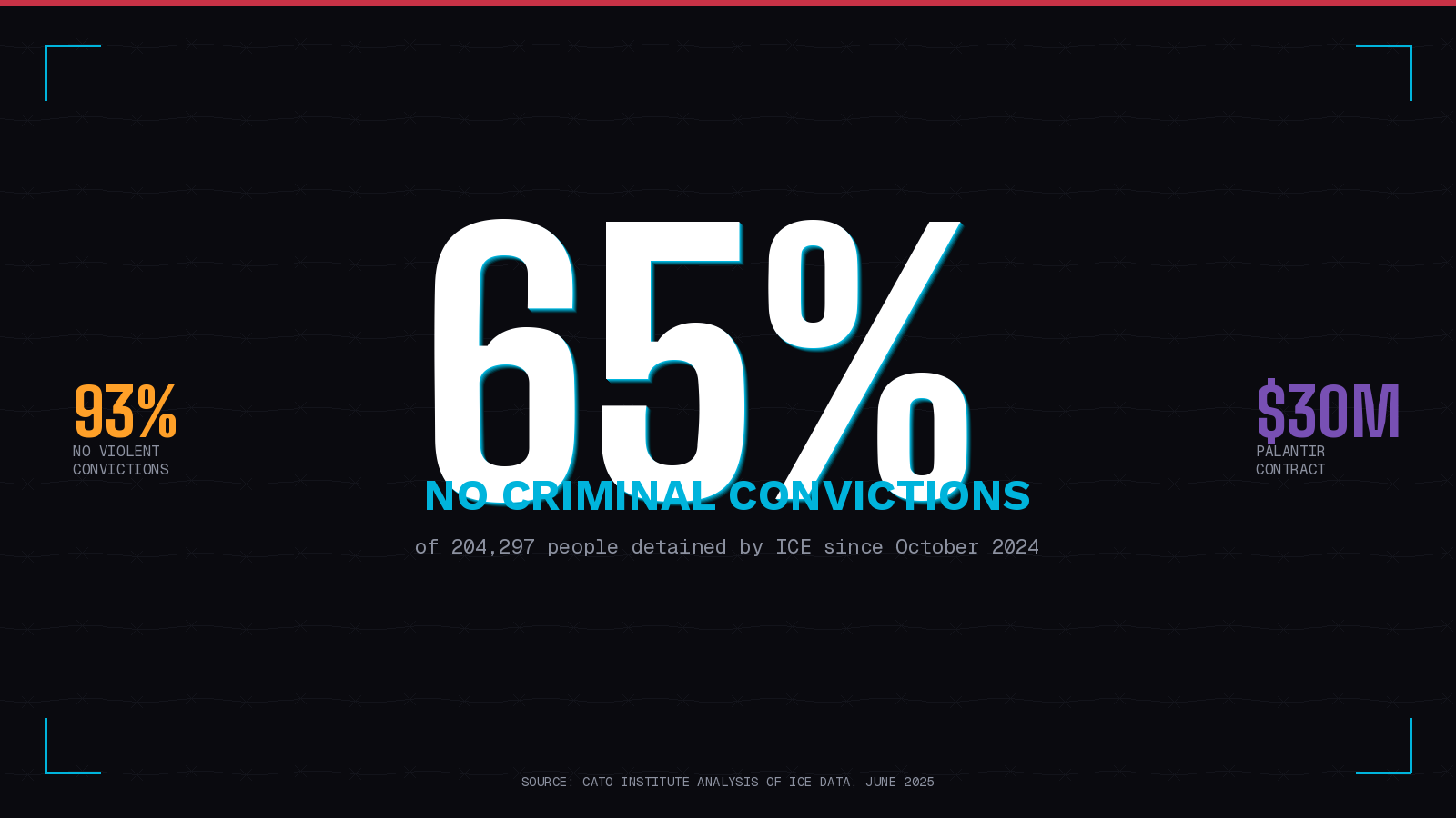 Cato Institute analysis of nonpublic ICE data found that 65 percent of people booked into detention since October 2024 have zero criminal convictions. Only 6.9 percent had violent convictions. That’s the data. The rhetoric doesn’t match.